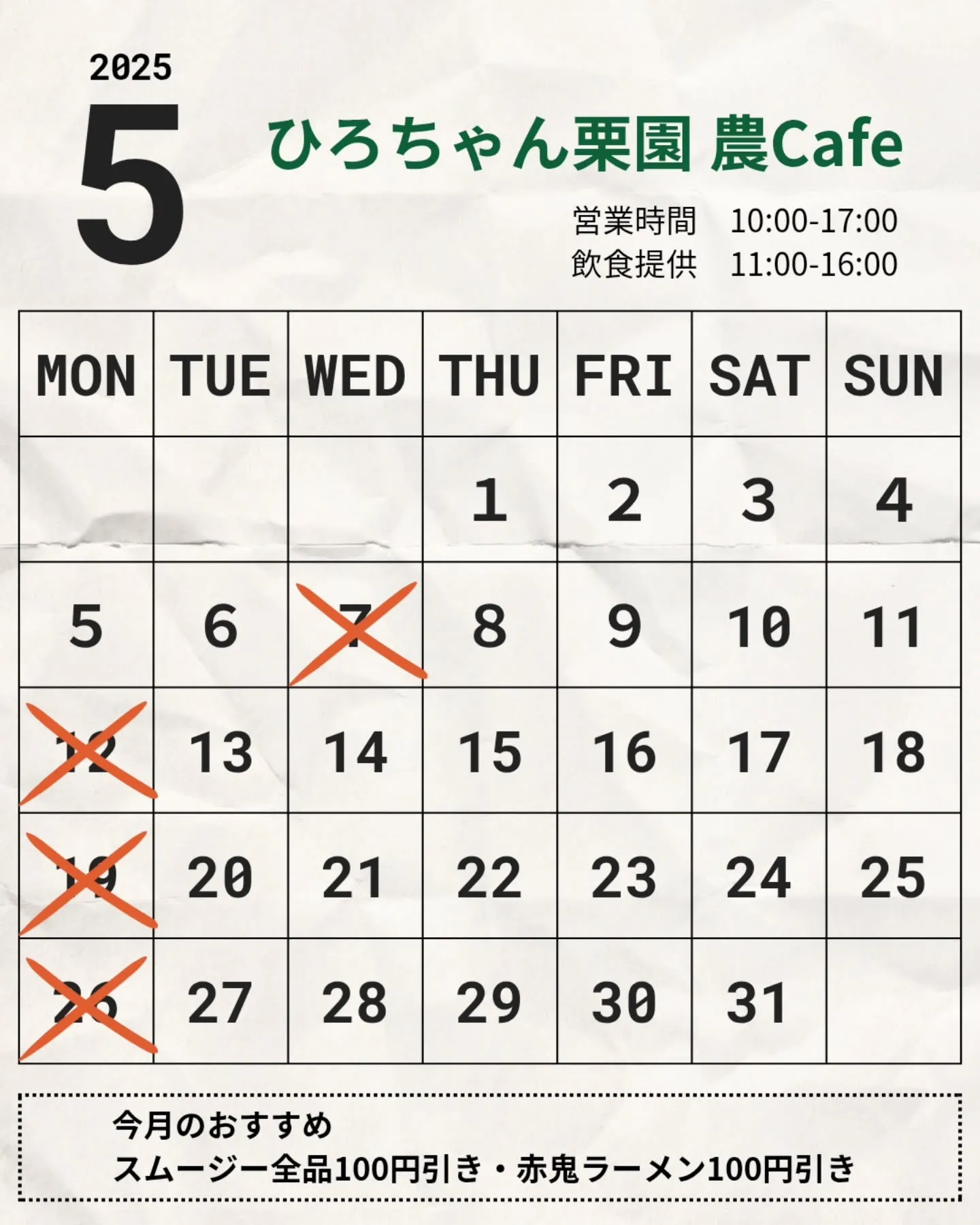 【5月の営業日のお知らせ】 GWのお出かけ先はお決まりですか? 「ひろちゃん栗園 農Cafe」でのんびり過ごしませんか (*´︶`*)ノ 5月はお得なメニューが盛りだくさん(*^^*) 🌟 丹波ご当地「赤鬼ラーメン」&スムージー → 各100円引き! 🌟大人気「濃厚チョコソフト」もお得に楽しめます! お出かけの際には、是非!ひろちゃん栗園 農Cafeに来てくださいね。 皆さまのお越しをお待ちしております(* ᴗ͈ˬᴗ͈)” ※営業日はカレンダーをご確認ください。